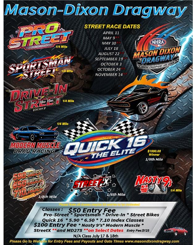 Pro-Street *Sportsman * Drive-In * 5.90 * 6.50 * 7.10 * QUICK 16 * Modern Muscle * Street-X * Nasty 9’s * Test & Tune